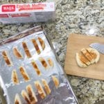 3. Cut muffins crosswise into five strips per muffin half, arrange in a single layer, cut sides down, on a rimmed baking sheet.